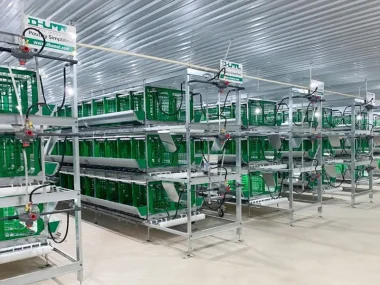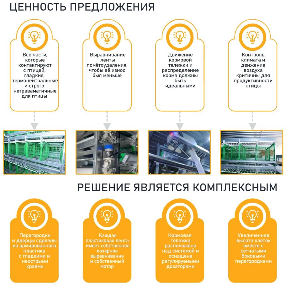 Наша новая система вертикальной фермы предлагает превосходное сочетание прочности, простоты и использования более термонейтрального материала - пластика, который существенно улучшает комфорт птицы.